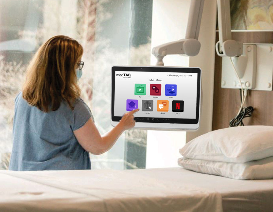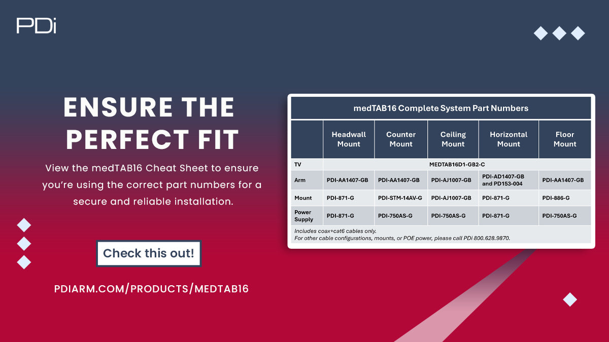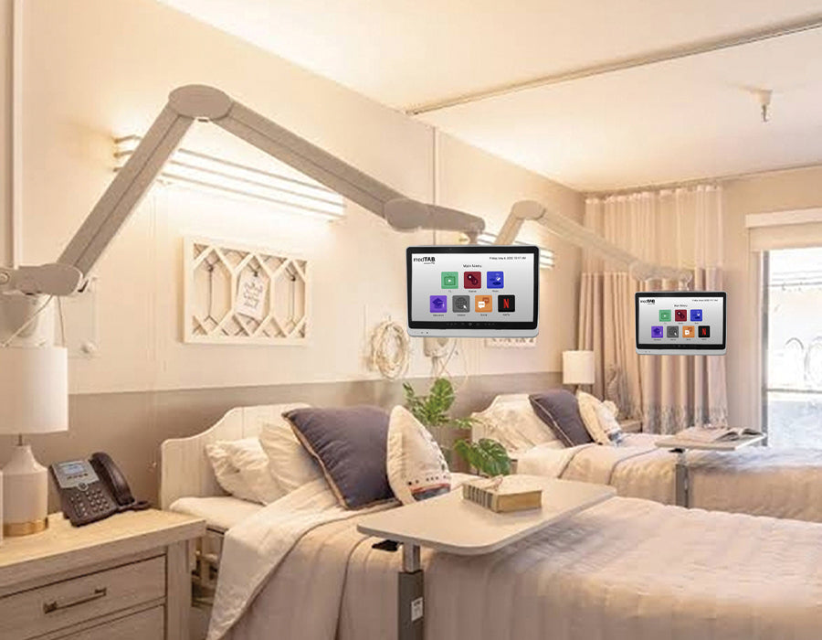 medTAB arm-mounted patient displays reduce neck, back and eye strain. PDi builds the complete, arm-mounted touchscreen patient TV system with secure PDi arms, arm mounts, and low-voltage power supplies.